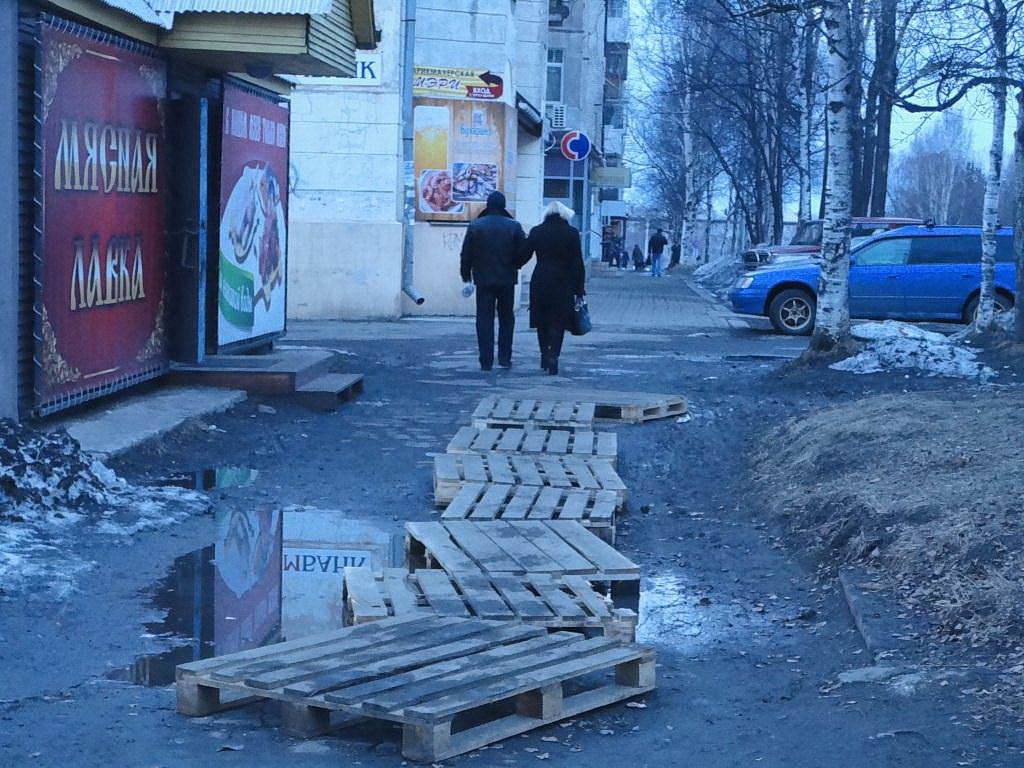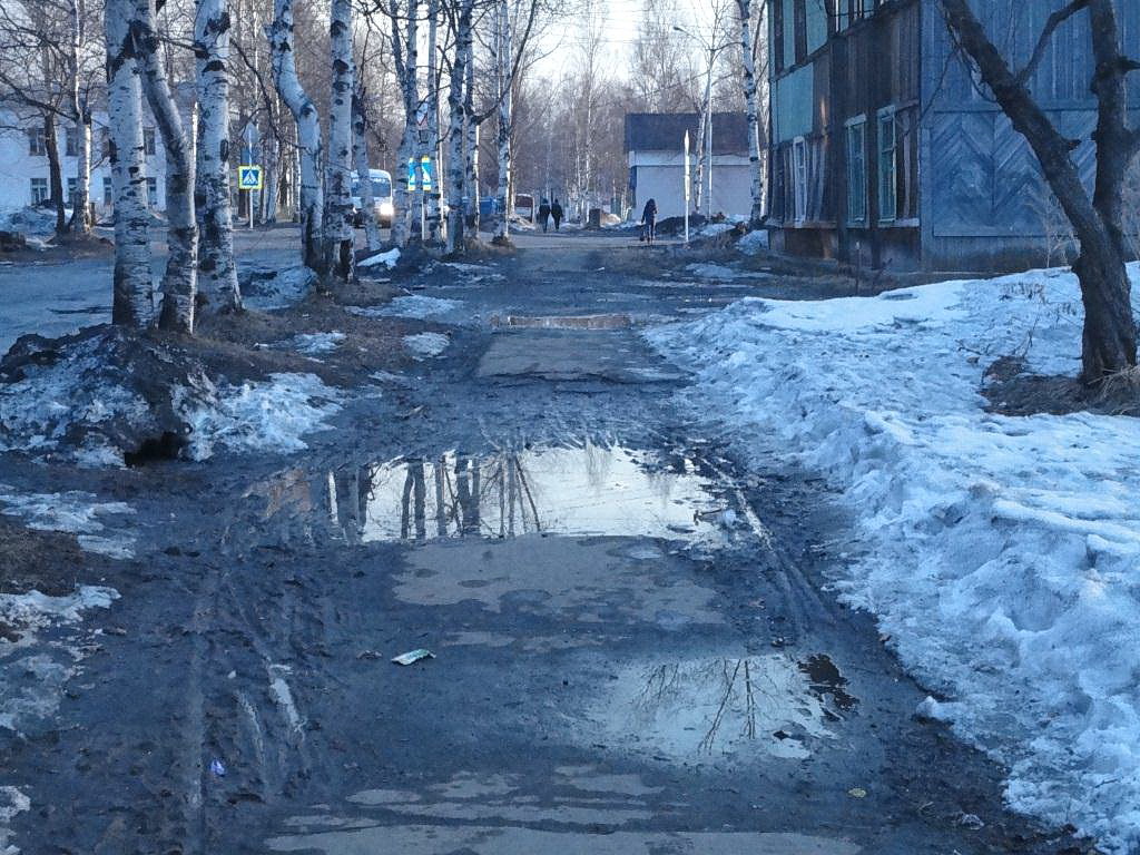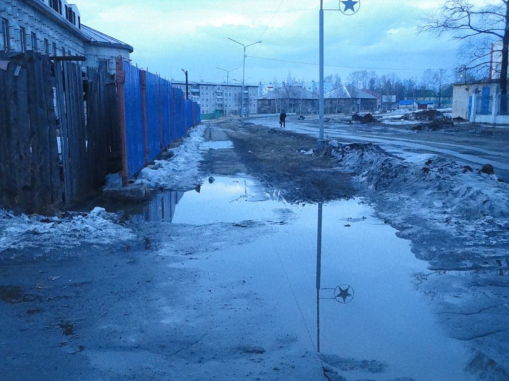 Меньшие водоемы, больше похожие на труднопроходимые пороги горных рек, приходится преодолевать и любителям спорта. Но ведь это, похоже, и хорошо: тренировки лишними не бывают. Например, по дороге к Дворцу спорта асфальт уже давно развалился и потрескался. Жаль, что по ул. Школьной ходят еще и ученики второй школы.